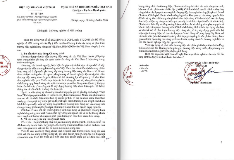 (Thế Giới Gia Cầm) – Phúc đáp Công văn số 2432/BNNMT-CCPT ngày 17/3/2026 của Bộ Nông nghiệp và Môi trường về việc lấy ý kiến dự thảo Chương trình xây dựng và phát triển thương hiệu ngành hàng nông sản Việt Nam, Hiệp hội Gia cầm Việt Nam đã có văn bản góp ý, nhấn mạnh sự cần thiết ban hành chương trình với các chính sách đồng bộ, thực chất.